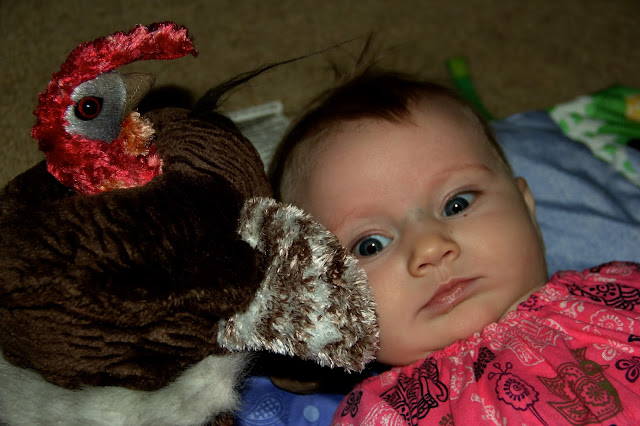 The turkey puppet always makes an appearance on Thanksgiving! This was Sloane's first time meeting him. |